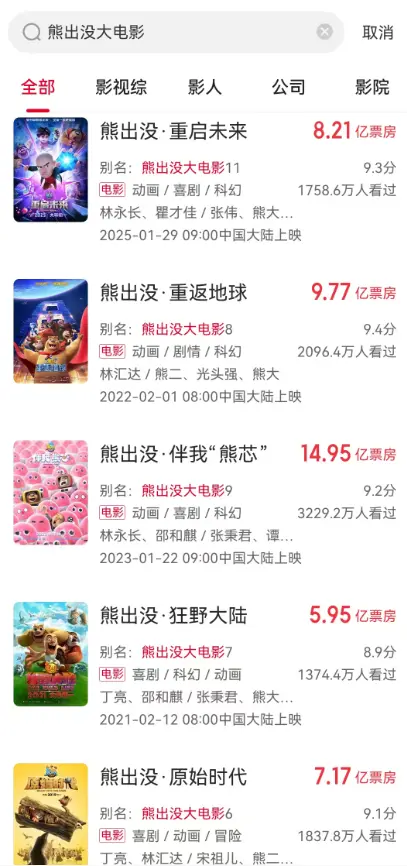 口罩期间都能突破5亿,3年前狂捞大概15亿,最多的时候甚至能达到19.8亿(2年前的《熊出没·逆转时空》),完全赚得盆满钵满。